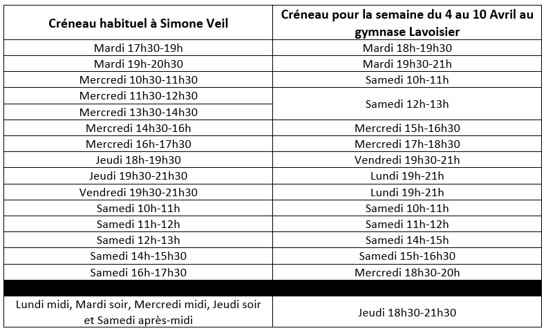 – Mercredi 18 Mai : 10h30-11h30 à S.Veil, 11h30-12h30 à S.Veil, 14h-15h à Lavoisier, 15h-16h30 à Lavoisier, 17h-18h30 à Lavoisier et 18h30-20h à Lavoisier également.