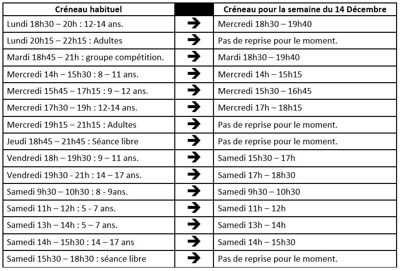 Vous trouverez ci-dessous votre créneau à partir du Lundi 4 Janvier 2021 et jusqu’à nouvel ordre. Les horaires et jours proposés tiennent compte de l’horaire du couvre-feu.